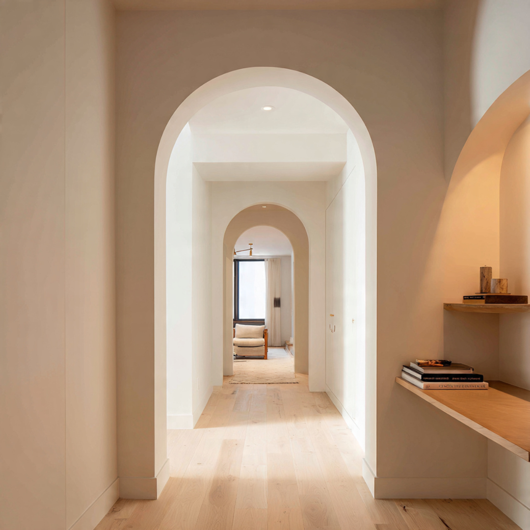 Arched doorways create a gentle visual flow between rooms, replacing abrupt thresholds with a more graceful passage.Built-In Niches & Shelving