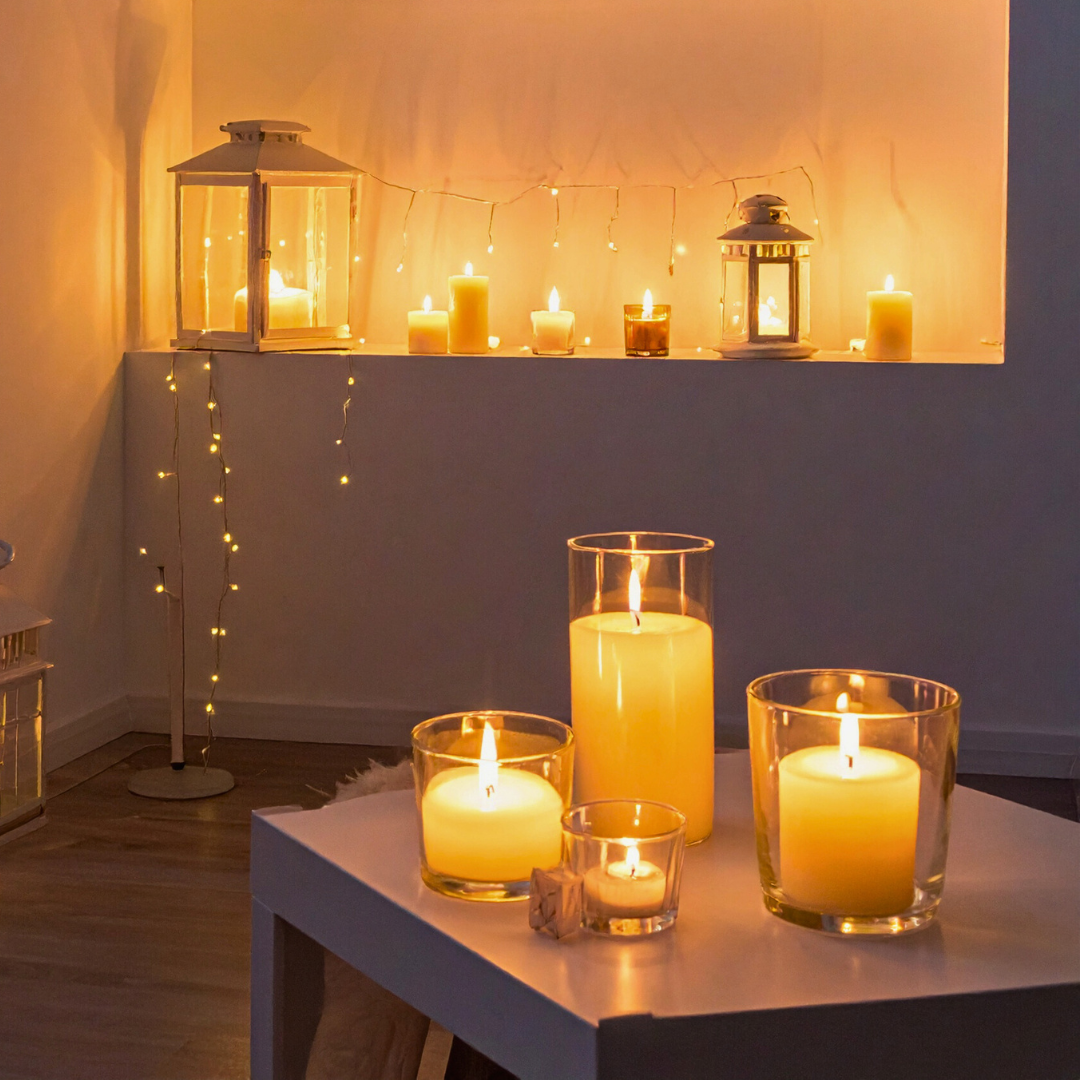 We use warm-toned bulbs, lanterns, glass votives, and candles to create a gentle, ambient glow. Instead of stringing multiple layers of fairy lights, we focus on placement: one cluster of candles on a coffee table, a single sculptural lamp in a corner, or a row of tea lights on a window sill. The result is a serene radiance that feels intimate and soulful.