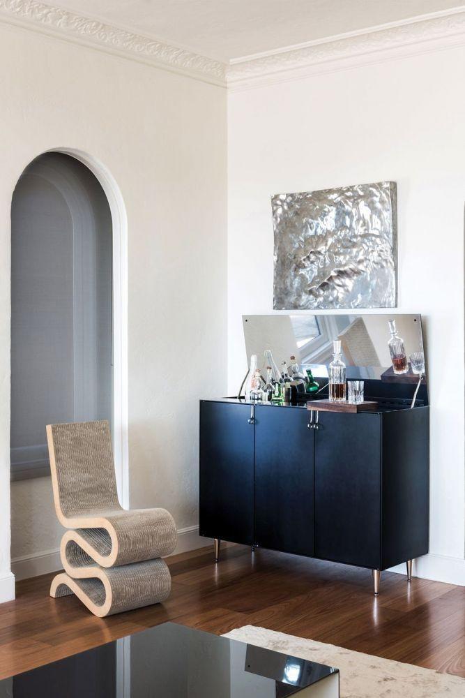 How clever is this flip-top cabinet-meets-bar? Designed by NICOLEHOLLIS, this modern living room is always ready to party. With a piece like this, you won't have to run back and forth to the kitchen to make cocktails for your guests, but you can also hide the booze when need by.