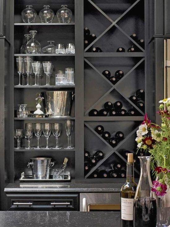 This classy home bar is sophisticated, graceful, and timeless. This style will endure trends, go across home styles, and fit into many people’s personalities and tastes. The black nook includes X box bottle shelves, shelves, a prep counter, some drawers and a cooler. To brighten up the look, decorate the bar with wine glasses, decanters, and silver buckets and trays.