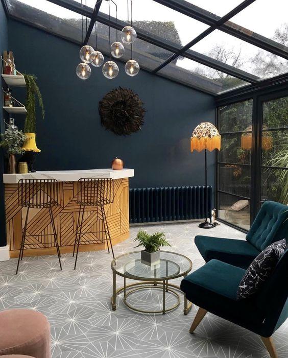 Turn your patio into a party or chill zone by adding a home bar. This glass-encased patio includes a minibar that can serve your favorite drink without you running to the kitchen. The geometric design of the bar is picked up by the very interesting floor detail. Add some vintage glass dome pendant lights, a couple of mid-century modern chairs for the refreshing outdoorsy vibe.