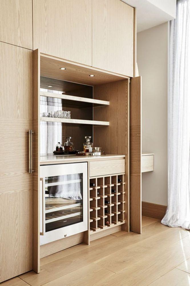 Designed by Fiona Lynch, this home bar is like a little speakeasy. Two-door opens to a spacious serving bar. This way, you can keep it closed up and save space when you're not entertaining