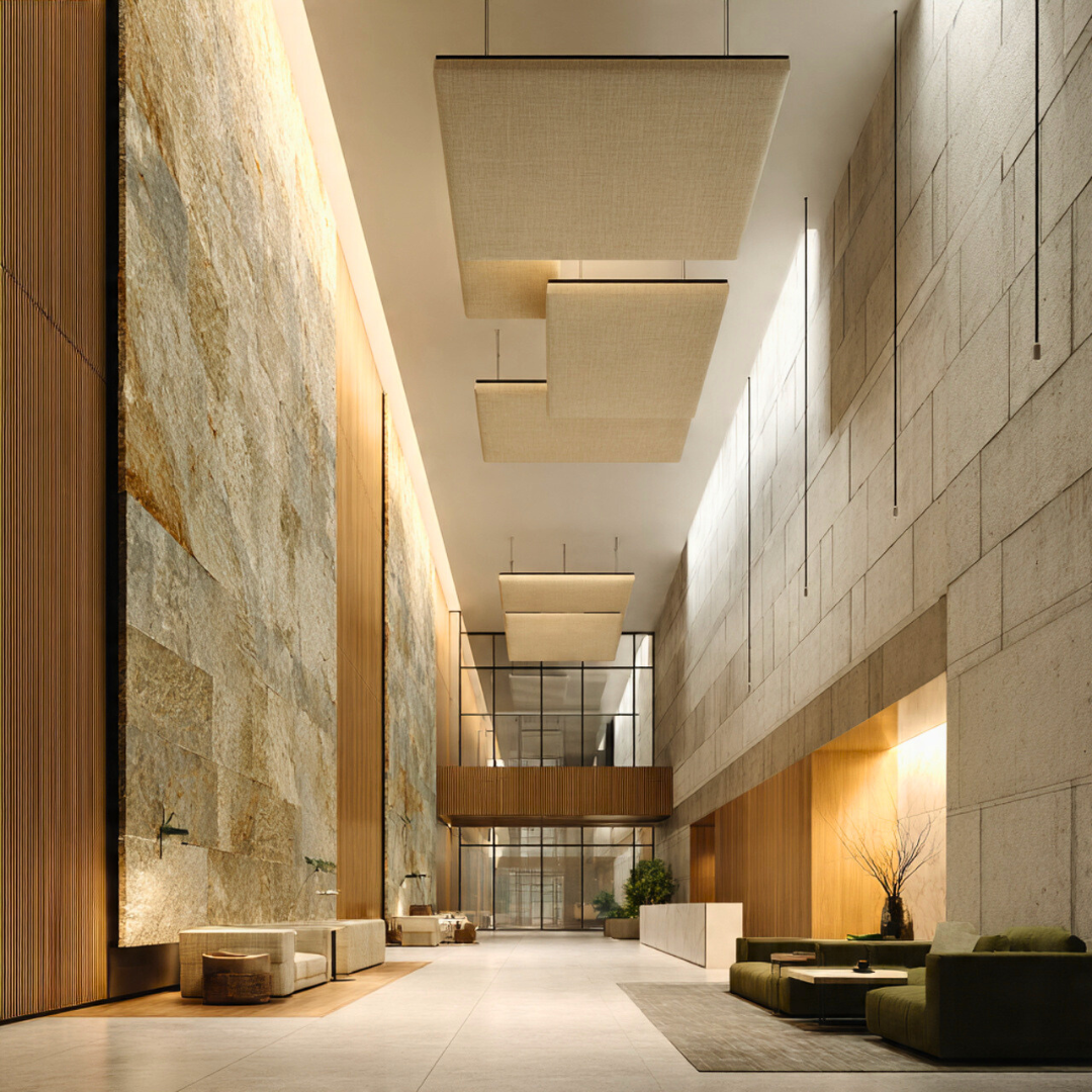 In biophilic corporate environments developed by Blucap Interiors, stone is balanced with absorptive materials — timber, textiles, acoustic systems — creating a calibrated sensory hierarchy. The interplay between solidity and softness mirrors natural ecosystems, preventing monotony while maintaining calm.