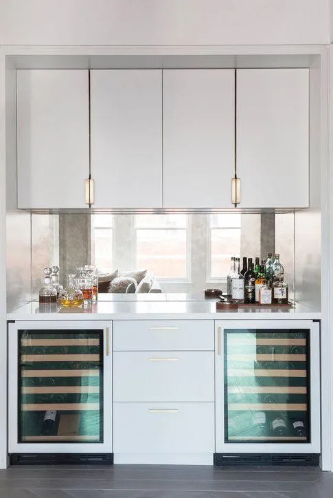 Not only are the symmetrical wine fridges aesthetically pleasing, but they're also conveniently located and such good use of the little space. The smokey mirrored backsplash brings the right touch of formal style to this space designed by Studio DB, too.