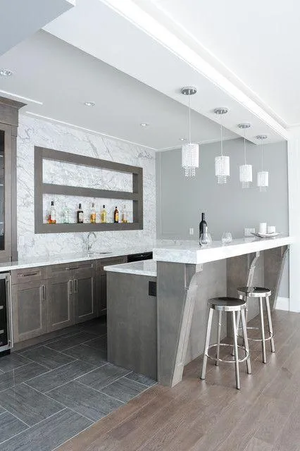 For those who aren’t afraid to party in the light, this bright and magnificent home bar is for you! The white, grey, and several shades in between complement the luxurious marble wall and counters. Complete the posh look with chrome bar stools and crystal pendant lights.
