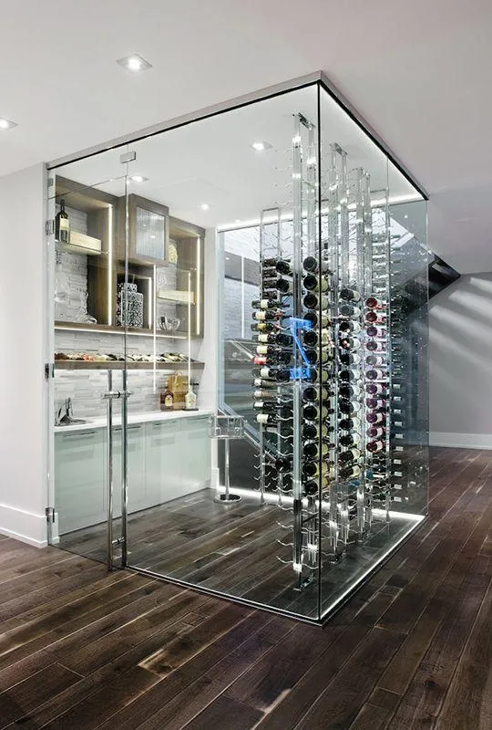 Bright, ultra-modern, arresting, and posh. When you want a separate wine room but still want it very much part of the house, this glassed-in wine room is for you. The wine racks on two sides of the room screen off direct view, while one wall serves as the counter and storage area.
