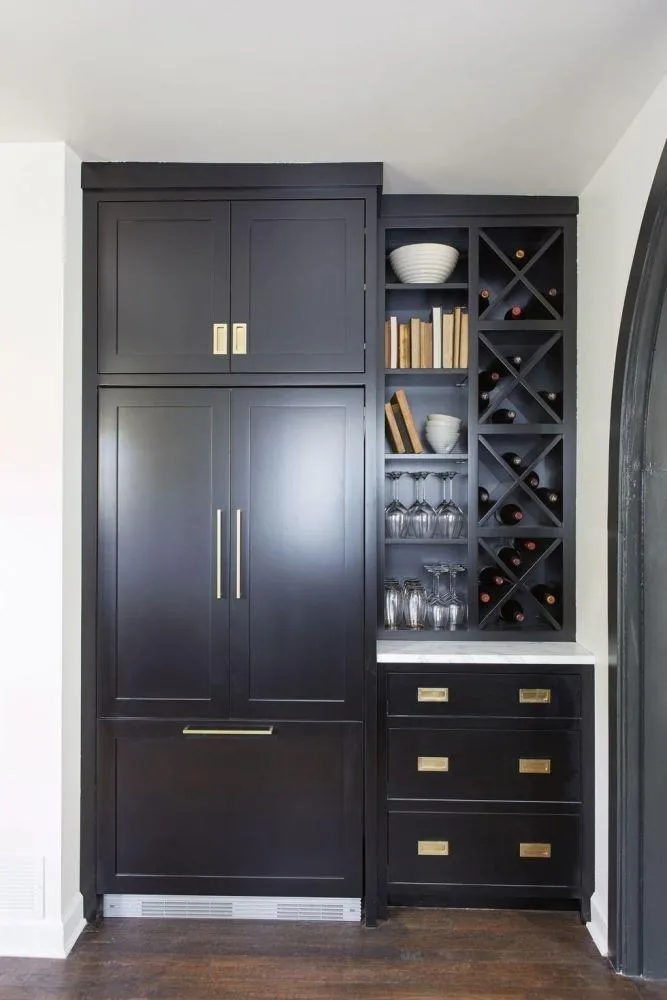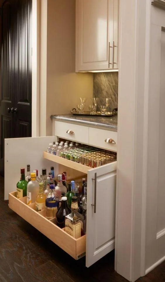 For people who love to entertain at home, this huge cocktail pantry is a must. You can build this in the kitchen, in the basement or game room, and even in the hallway. Wine coolers below and storage shelves above. The middle shelf serves as the prep counter. You can close up the pantry with sliding glass doors.