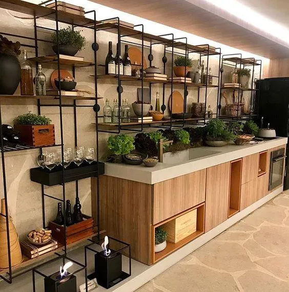 This garden-inspired home bar is refreshing, trendy, and fun! Build a home bar that will satisfy your need for both gardening and enjoying your favorite cocktail. Equipped with a sink, a cooler, lots of counter space, and a chic black metal shelving. Your guests will enjoy just lounging in this beautiful room.