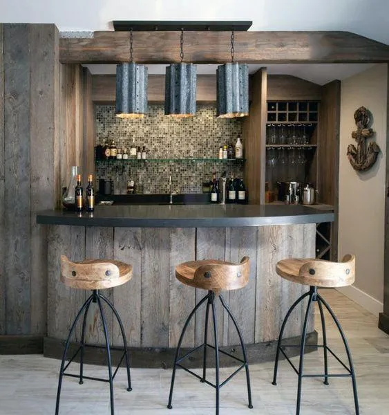 This vibe is all about great conversations, amazing companions, good times. All you need for a barn-inspired home bar is a chalkboard wall, a wood slab counter, a few vintage wire lighting, and bar stools. Perfect for basements or man cave settings.