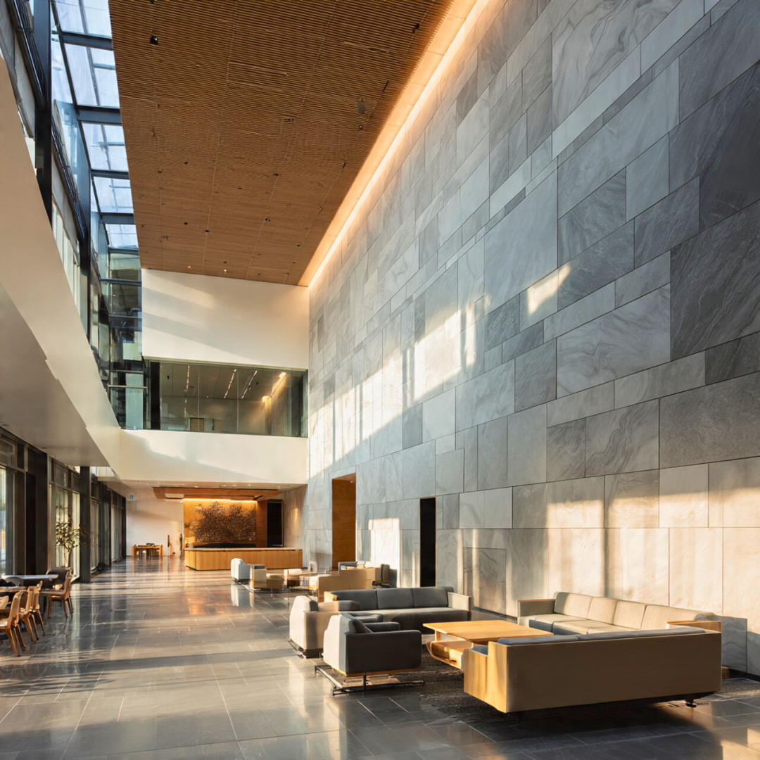 At Blucap Interiors, we carefully study solar exposure, daylight patterns, and spatial volumes before specifying stone, ensuring that its environmental contribution is intentional rather than incidental. This measured variation mirrors natural rhythms and reduces environmental fatigue within large corporate settings.
